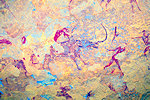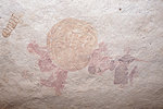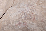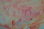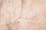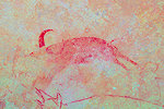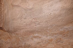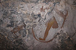 The most interesting shelter at Tin Talak is a small deep cave (TL8) not far from the previous site, with some very strange yellow paintings on the ceiling. The animals and human figures seem to show some affinity to Roundhead depictions, but they are also markedly different, are executed in a much cruder technique, and their general appearance appears to be relatively recent. Interestingly other than these unique paintings, there are no other styles present in the shelter.