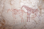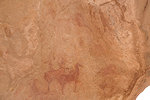 There are a number of other sites in the area, strangely none of them have been recorded by the 1960 Lhote mission, despite having done a very thorough job elsewhere. Most of them have Roundhead affinities, one site in particular is very interesting: the scene depicts a very large cattle-like animal, executed in red continuous outline with a white infill, one of the defining features of the roundhead style. However on close scrutiny the panel also shows some smaller, faint but unambiguous cattle, which are superimposed by the horns of the large animal, rather complicating the conventional wisdom about the dating and nature of the "Roundhead" paintings.
