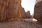 The Akba Edjefane is one of the few passes suitable for camels, though after the big rains it was in a rather bad condition, our crew needed to do quite a bit of path clearing to move rocks and boulders out of the way of the camels. Nevertheless it was a fairly easy descent, like the nearby Akba Aroum it is one continuous slope from top to bottom, with a few kilometres of more or less level terrain till one reached the car track. We were comfortably down by midday, taking our lunch and rest at the waiting cars before heading into Djanet for the night.