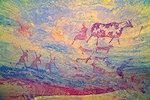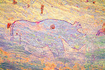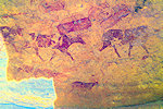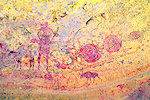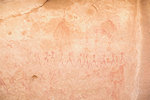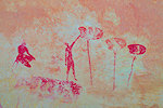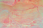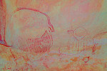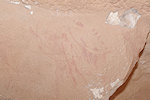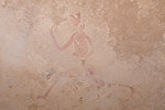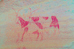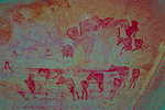 Near the northern part of the region there is a large shelter (TL7) which contained a fine but very faded herd of cattle on the rear wall. Scrutinizing the rest of the shelter we spotted some faint figures on the ceiling, which turned out to be an interesting group of four therianthropes, the finest scene so far in the area.