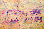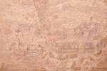 By midday we reached the main shelter of Ralan Rahla, about two kilometres south of the Oued Amazar. This locality was first documented by Brenans, followed by Yolande Tschudi (as Oua Molin) and Henri Lhote (only the chariots). There is a bizarre scene of a strange animal on top of a conical structure adjacent to the chariots, interpreted as a cock in some tracings, or an unrelated galloping horse (Jean-Loïc Le Quellec & Annie Mouchet, Cahiers de l'AARS 21, 2020). There is also a butchering scene in the shelter which was copied by Tchudi.