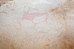 While we were busy taking photos at all these sites, Abu Bakr set about searching, and in a small shelter just behind one of the known sites he found one of the missing scenes depicted on a Lhote relevé. A dozen metres away he found more paintings in another shelter which apparently were not copied, including a lovely running feline (or canid ?) in the roundhead style.
