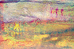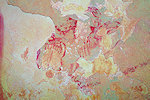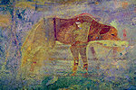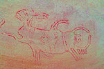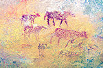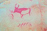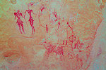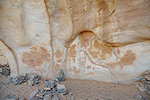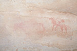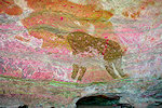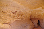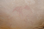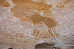 The site was in the direction of our intended passage, we packed camp and walked up to it while our crew were still out looking for the camels. On approaching one first notices some bright camel period paintings on the rear wall of the shelter, the rather faint scene with elephants and therianthropes is on the ceiling.