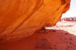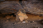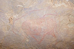 On satellite imagery I have identified a number of shelters with stone enclosures, both to the north and the south east of Ouan Segofar proper. The northern area was about 3 kilometres away, while Koen elected to return to camp the rest of us decided to take advantage of still having the cars and drive to the low row of hills before parting with them. We checked all of the identified stone structures, some were attached to suitable shelters, but we found nothing. Cornelius and Ugo split to look for animal tracks, while with Magdi we started heading back to camp. At the rear of a hill between us and camp we spotted a large shelter, and checking it out we did find a few nice paintings of cattle and human figures, with a big bundle of nomads' possessions still hanging from the ceiling. It turned out to be the only new rock art find we managed to make in the area over the two days. We got back to camp and spent a lazy afternoon, a welcome chance after the constant walking over the past nearly three weeks.