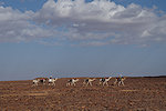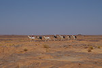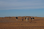 Our route was agreed with Dagarat to be generally to the south, descending on the pass and meeting the cars at midday on day 10. However, the actual daily route was pretty much determined by the camel drivers from Tin Akn, who knew the passable camel trails and also which gueltas had water, something needed for both the camels and also for wildlife spotting. Dagarat knew that our main objective was to see wildlife, we started out in the morning towards a place called Ibaren Adou, the agreed meeting place with the camels at midday. We marched towards the south west on the flat plateau, and after about two hours we came upon a broad shallow wadi with abundant vegetation. Approaching it carefully, we did find a small herd of three Dorcas gazelle grazing in the middle of the depression. They spotted us but did not bolt, for a while they looked at us until slowly they turned and retreated in a slow trot. While they were quite far it was still a reasonably good and quite unexpected photo opportunity.