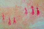 We expected to find at least something in the numerous valleys and rocky areas between TM 9 and the main corridor of Timenzouzine, but despite a very thorough search of all possible shelters and surfaces, we found absolutely nothing. We reached the main cluster of sites, there scrutinizing the high shelter behind the main valley (TM 5) we finally did find one of the missing panels on a very weathered wall, a row of small roundhead figures.