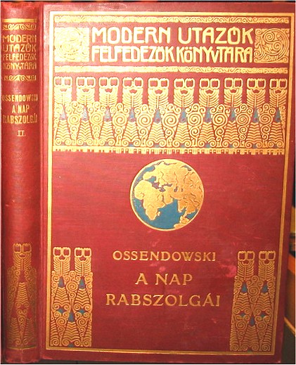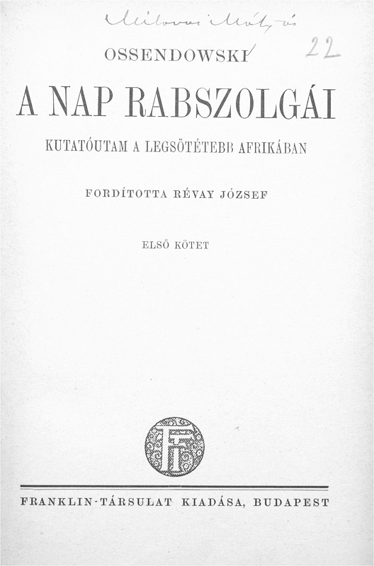 Ossendowski's ninth and last title, also signalling the end of the series coinciding with the fulll absorbtion of Lampel into Franklin. It is an account of a research expedition in West-Central Africa, translated by Révay József. It is known in five binding versions with no difference in the interiors, the Classic III and Cassic IV. with MUFK series titles, the plain crimson version, the crimson half cloth binding with gilt globe on the cover, and a rare Classic IV. half cloth with MFTK series titles but no series half title. The dust jacket is known, however it is uncertain if all versions had the same. Apparently the title remained in print unchanged until 1943, the likely date of the Classic IV. half cloth version with MFTK series title.