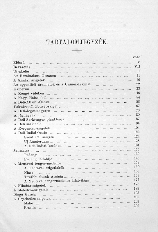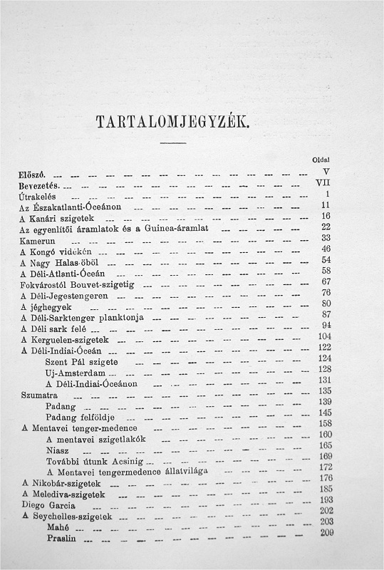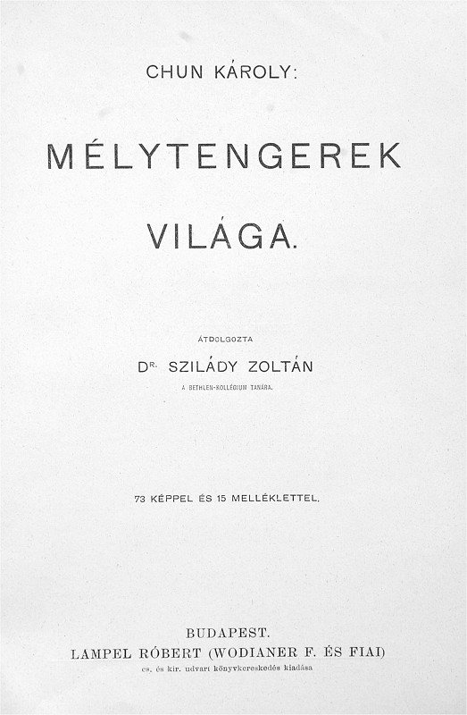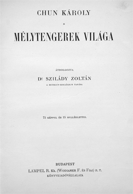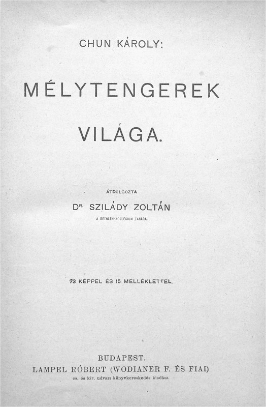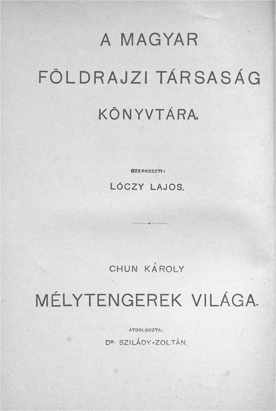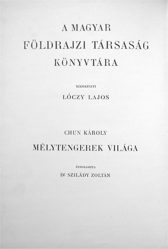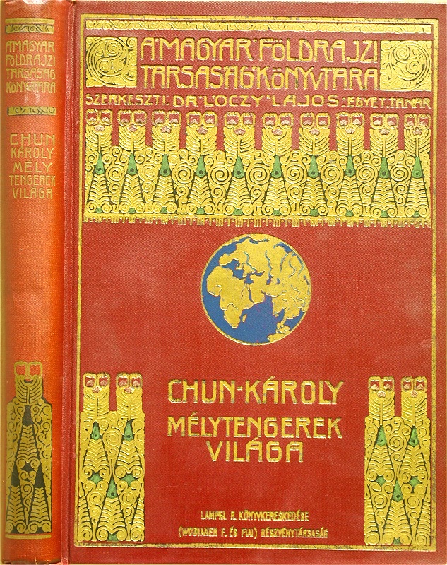 The account of the 1898-99 German deep-sea expedition on board the steamer Valdivia by the expedition leader (at the time it was customary to translate the given names of authors to their Hungarian equivalent), translated and re-worked by Dr. Zoltán Szilády. There have been at least three separate editions, the first appearing in the Roman numeral and Picture cover bindings, with the half-titles containing the roman numeral series volume numbers, and the publisher mark carrying the "Cs. és kir." royal purveyors title, and uniquely a Lampel printer's mark dated 1902 on the reverse of the title page. The second edition, known in the full cloth Picture cover and Classic I scaled bindings, appears to be of the same print run with the original Lampel printer's mark and "Cs. és Kir." titles with only the half-title changed. The Classic I. scaled is known both in Franklin and Leszik binders' versions, with the latter having different endpapers. Like #1 and #6 there is a Classic I. scaled version (and presumably a corresponding full cloth Picture cover) that appears to be an entirely new print run with different half title and title pages (though the rest of the interior appears to be the same). This third edition is also known in the half cloth Picture cover and plain Classic I binding versions (the last around 1926), apparently a new release with unchanged contents after the War. Other than the title and half title, the interior of all versions appear to be identical,on 279 pages with 73 illustrations dispersed among the text and 15 plates (including one map).