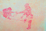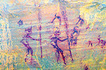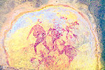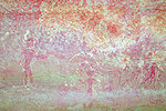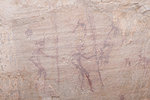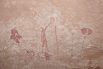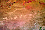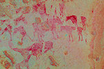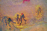 Near the northern part of the region there is a large shelter (TL7) which contained a fine but very faded herd of cattle on the rear wall. Scrutinizing the rest of the shelter we spotted some faint figures on the ceiling, which turned out to be an interesting group of four therianthropes, the finest scene so far in the area.