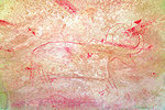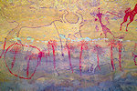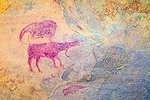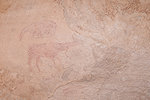 There are a number of other sites in the area, strangely none of them have been recorded by the 1960 Lhote mission, despite having done a very thorough job elsewhere. Most of them have Roundhead affinities, one site in particular is very interesting: the scene depicts a very large cattle-like animal, executed in red continuous outline with a white infill, one of the defining features of the roundhead style. However on close scrutiny the panel also shows some smaller, faint but unambiguous cattle, which are superimposed by the horns of the large animal, rather complicating the conventional wisdom about the dating and nature of the "Roundhead" paintings.