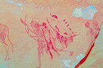 Going back to RC8 we had lunch and a little rest before continuing further south. Passing a shelter we found a number of white animal figures which appear to have been unrecorded. Interestingly the animals at the left are cruder and clearly superimposed over the red-outlined classic roundhead style animals at right.