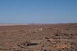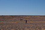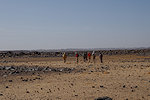 Our route was agreed with Dagarat to be generally to the south, descending on the pass and meeting the cars at midday on day 10. However, the actual daily route was pretty much determined by the camel drivers from Tin Akn, who knew the passable camel trails and also which gueltas had water, something needed for both the camels and also for wildlife spotting. Dagarat knew that our main objective was to see wildlife, we started out in the morning towards a place called Ibaren Adou, the agreed meeting place with the camels at midday. We marched towards the south west on the flat plateau, and after about two hours we came upon a broad shallow wadi with abundant vegetation. Approaching it carefully, we did find a small herd of three Dorcas gazelle grazing in the middle of the depression. They spotted us but did not bolt, for a while they looked at us until slowly they turned and retreated in a slow trot. While they were quite far it was still a reasonably good and quite unexpected photo opportunity.
