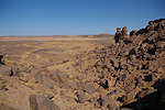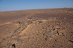 The bulk of the reported sites as far as we could see were in a narrow and deepening wadi further west that led towards the edge of the plateau towards the north. As we approached, we fund a very nice example of an "antenna monument", a peculiar type of funerary monument with a central tumulus and two protruding straight low walls at an angle. These monuments may be found all over the western and central Sahara, some huge while this one was of an unusually modest size.