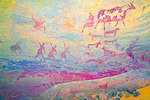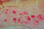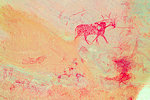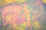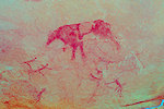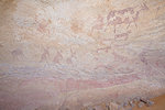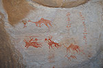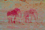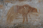 The site was in the direction of our intended passage, we packed camp and walked up to it while our crew were still out looking for the camels. On approaching one first notices some bright camel period paintings on the rear wall of the shelter, the rather faint scene with elephants and therianthropes is on the ceiling.