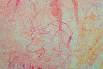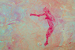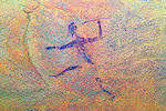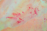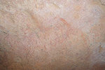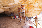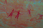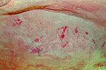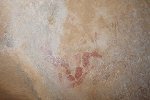 While we were scrutinizing the walls of the second site we found, Mike (a professional cave diver with an affinity to cramped places) explored a low uncomfortable shelter where I would never have looked for paintings, and found a very nice panel of somewhat unusual human figures, hidden on the slanting ceiling.
