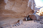 On satellite imagery I have identified a number of shelters with stone enclosures, both to the north and the south east of Ouan Segofar proper. The northern area was about 3 kilometres away, while Koen elected to return to camp the rest of us decided to take advantage of still having the cars and drive to the low row of hills before parting with them. We checked all of the identified stone structures, some were attached to suitable shelters, but we found nothing. Cornelius and Ugo split to look for animal tracks, while with Magdi we started heading back to camp. At the rear of a hill between us and camp we spotted a large shelter, and checking it out we did find a few nice paintings of cattle and human figures, with a big bundle of nomads' possessions still hanging from the ceiling. It turned out to be the only new rock art find we managed to make in the area over the two days. We got back to camp and spent a lazy afternoon, a welcome chance after the constant walking over the past nearly three weeks.
