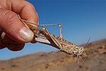 Before dawn the naturalist party set out to the edge of the broad valley along our route about a kilometre from camp which they have already scouted the previous evening, in hope of catching some grazing animals out on the plain at sunrise. We were to follow once the camp was packed and ready for loading. We were planning a long morning march till the shelter of In Djoua and a little beyond, to camp in the vicinity of another big guelta that may attract barbary sheep and possibly gazelle. We started out about an hour after sunrise, and soon caught up with the others, who again did not see anything. This is not to say we saw no animals, only the large mammals were lacking, there was plenty of life along the way under our feet. In the morning I caught a big Desert Locust (Schistocerca gregaria) that was still a bit stiff after the cold night, and a little later I found a rarity, a Zygentoma (silverfish) species which I have never encountered before anywhere in the Tassili (and only once at Jebel Uweinat). We also passed a guelta with the typical water beetles, but saw no fresh tracks of any larger mammals around it.